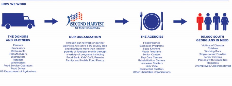 How our food bank works Second Harvest of South Georgia’s Food Bank program distributes food to partner agencies who directly serve people that otherwise are unable to provide adequate food for themselves or their families. Click on the diagram below to see a larger image. Search Our Site Email Update Sign Up Please enable JavaScript in your browser to complete this form.Please enable JavaScript in your browser to complete this form.Sign Up