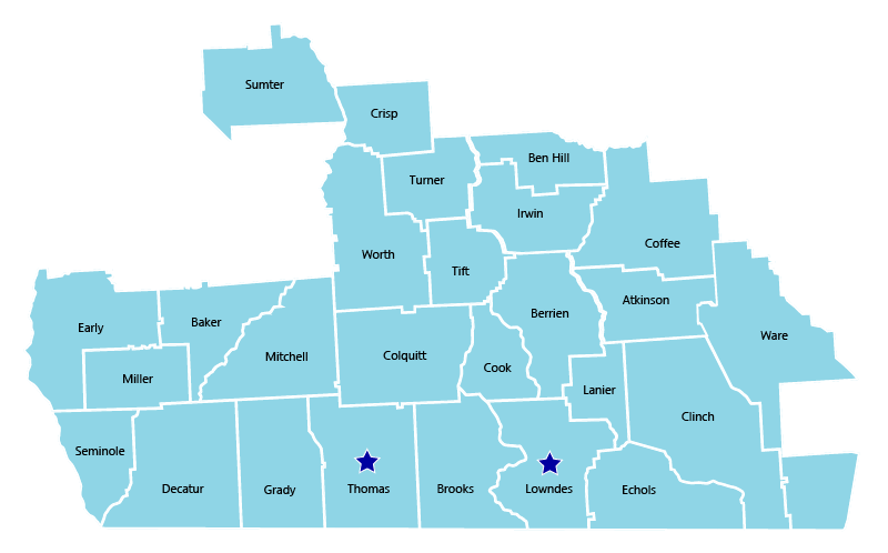 The following is a map of Second Harvest of South Georgia’s 26 county service area with the locations of our branches indicated.